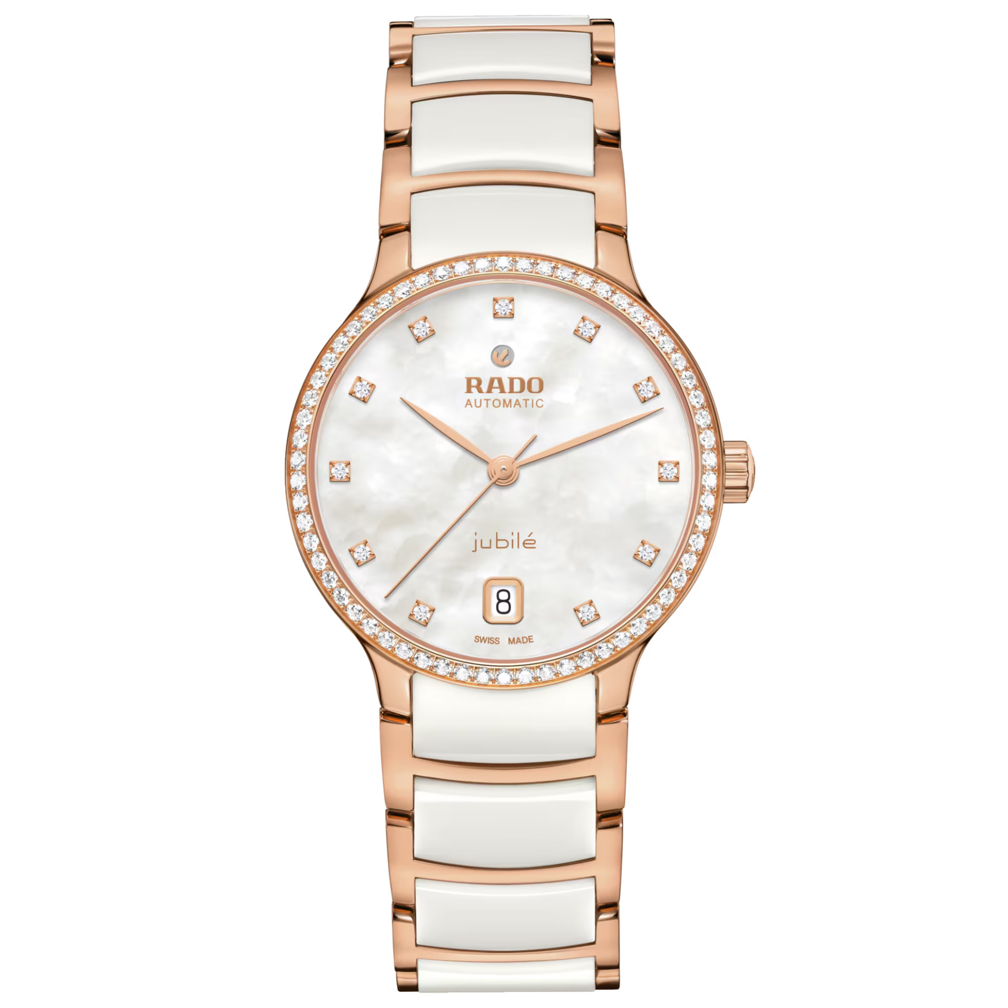 Ref. R30230902 - Erleben Sie mit der Centrix Super Jubile die harmonische Verbindung von künstlerischem Ausdruck und raffiniertem Design. Das 35 mm grosse Gehäuse aus Edelstahl mit roségoldfarbener PVD-Beschichtung ist mit einer Lünette aus Edelstahl mit roségoldfarbener PVD-Beschichtung versehen, die mit 60 Diamanten im Brillantschliff Top Wesselton VS-SI besetzt ist. Dies wird von einem gewölbten Saphirglas mit beidseitiger Entspiegelung gekrönt, sodass eine einwandfreie Ablesbarkeit gewährleistet ist. Im Herzen der Uhr schlägt das fein justierte, in fünf Lagen regulierte und mit einer Nivachron™ Spiralfeder ausgestattete Automatikwerk R763, das eine aussergewöhnliche Ganggenauigkeit und eine beeindruckende Gangreserve von 80 Stunden bietet. Es ist durch den Gehäuseboden aus Saphirglas sichtbar. Das weisse Perlmuttzifferblatt mit 11 Top Wesselton VS-SI Brillantschliff-Diamanten als Indizes und einem Datumsfenster bei 6 Uhr strahlt zeitlose Eleganz aus.