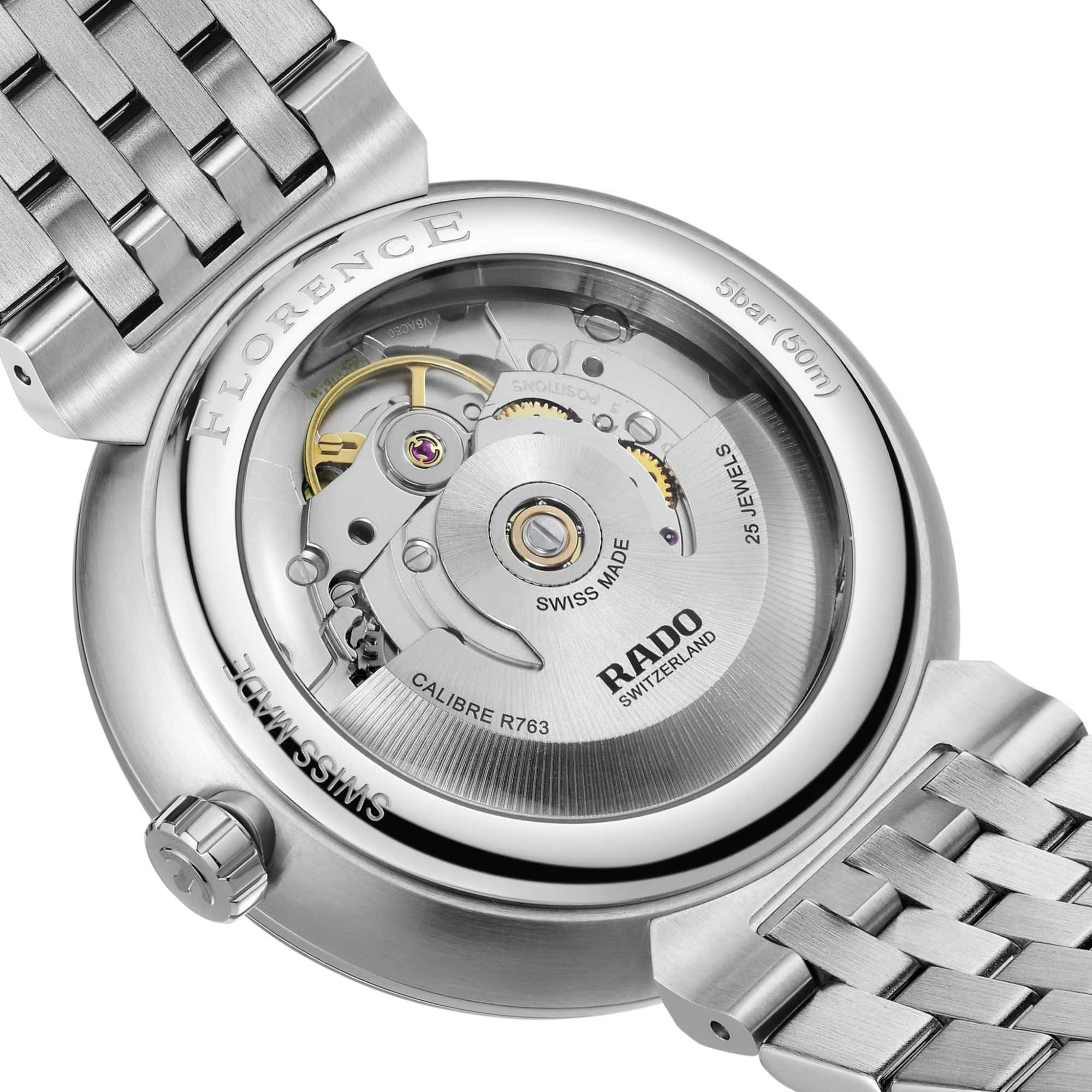 Ref. R48903153 - Entdecken Sie mit der legendären Rado Florence die zeitlose Verbindung aus Schweizer Präzision und Eleganz. Das 39 mm grosse Gehäuse der Uhr wird von einem randlosen Saphirglas gekrönt, dessen schwarz metallisierter Rand farblich auf das Zifferblatt abgestimmt ist. Dieses Saphirglas dient gleichzeitig als schützende Vorderseite und als Lünette, die nahtlos in das Gehäuse integriert ist und so das ikonenhafte und elegante Profil der Florence unterstreicht. Das schwarze Zifferblatt mit seinem eleganten Prägemuster dient als Theaterkulisse und zeugt von viel Liebe zum Detail. Die kontrastierenden rhodiumfarbenen Indizes und das bewegliche Rado Ankersymbol mit gebürstetem und poliertem Finish bilden einen reizvollen Kontrast zum schwarzen Hintergrund. Abgerundet wird das Gehäuse durch ein Edelstahlarmband mit gebürsteten und polierten Gliedern, das mit einer Dreifachschliesse aus Edelstahl am Handgelenk gesichert wird. Unter dem Gehäuseboden aus Saphirglas im Box-Shape-Stil verbirgt sich die Seele der Florence: das Automatikwerk Kaliber R763. Das in fünf Lagen fein justierte Uhrwerk mit einer Nivachron™ Spiralfeder bietet eine hohe Ganggenauigkeit und eine robuste Gangreserve von 80 Stunden. Das unterstreicht den hohen Stellenwert, den Rado der Perfektion beimisst.