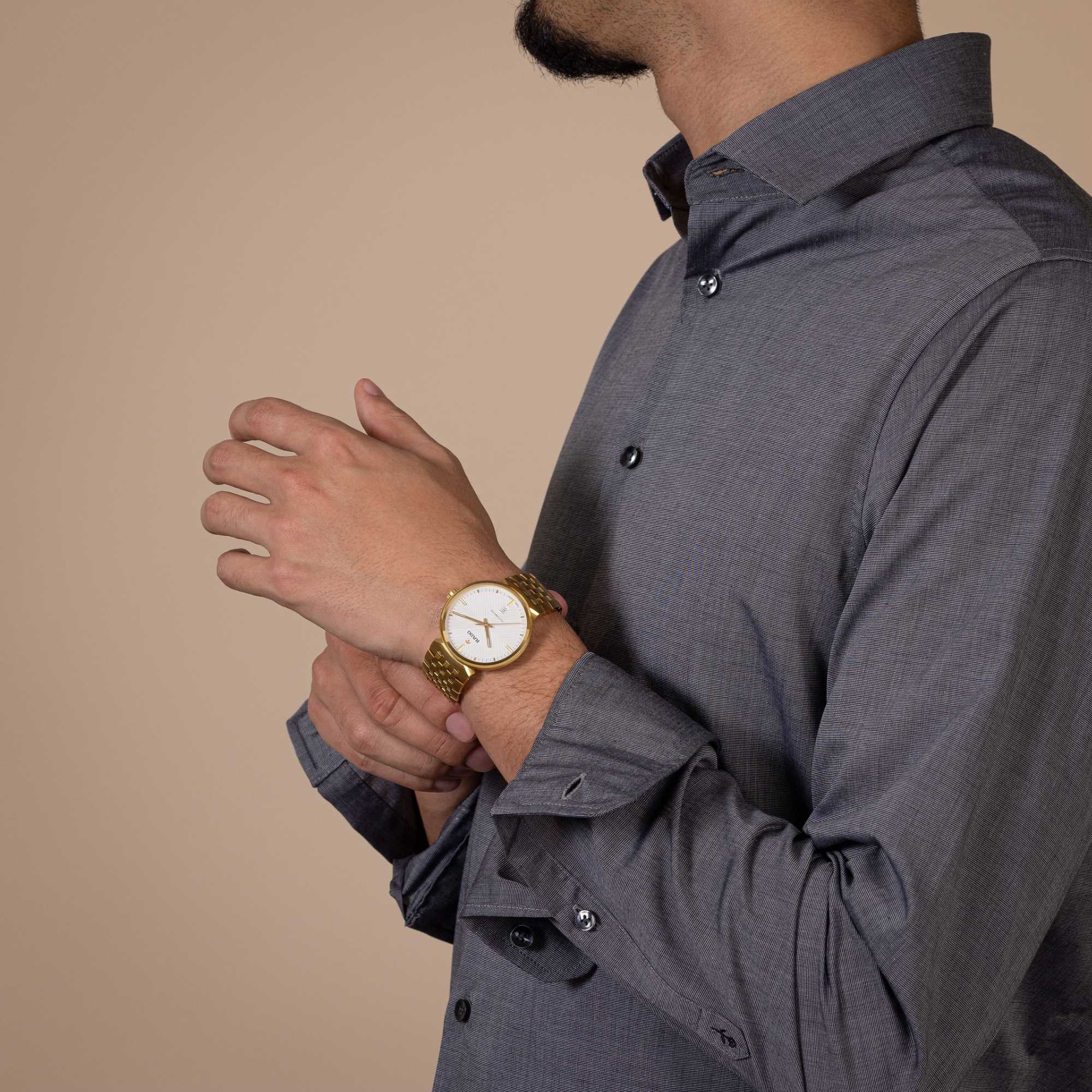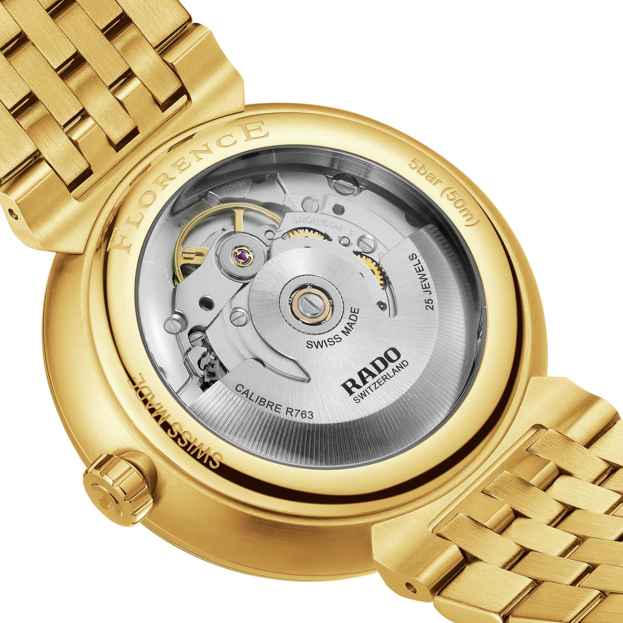 Ref. R48904013 - Entdecken Sie mit der legendären Rado Florence die zeitlose Verbindung aus Schweizer Präzision und Eleganz. Das 39 mm grosse Gehäuse der Uhr wird von einem randlosen Saphirglas gekrönt, dessen metallisierter Rand farblich auf das gelbgoldfarbene Gehäuse abgestimmt ist. Dieses Saphirglas dient gleichzeitig als schützende Vorderseite und als Lünette, die nahtlos in das Gehäuse integriert ist und so das ikonenhafte und elegante Profil der Florence unterstreicht. Das silberweisse Zifferblatt mit seinem eleganten Prägemuster dient als Theaterkulisse und zeugt von viel Liebe zum Detail. Die kontrastierenden gelbgoldfarbenen Indizesund das bewegliche Rado Ankersymbol mit gebürstetem und poliertem Finish bilden einen reizvollen Kontrast zum silberweissen Hintergrund. Abgerundet wird das Gehäuse durch ein gelbgoldfarbenes PVD-Edelstahlarmband mit gebürsteten und polierten Gliedern, das mit einer Dreifachschliesse aus Edelstahl am Handgelenk gesichert wird. Unter dem Gehäuseboden aus Saphirglas im Box-Shape-Stil verbirgt sich die Seele der Florence: das Automatikwerk Kaliber R763. Das in fünf Lagen fein justierte Uhrwerk mit einer Nivachron™ Spiralfeder bietet eine hohe Ganggenauigkeit und eine robuste Gangreserve von 80 Stunden. Dies unterstreicht den hohen Stellenwert, den Rado der Perfektion beimisst.