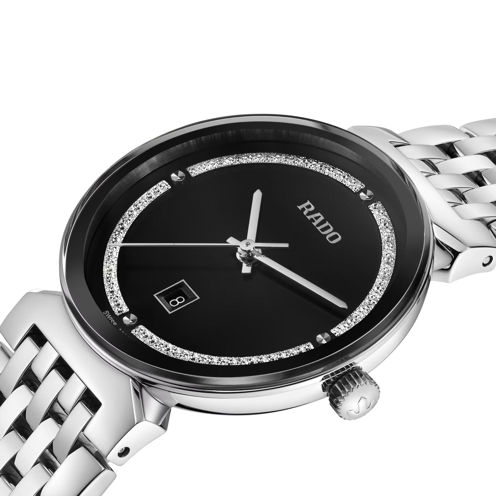 Gehäuse, Krone, Lünette und Gehäuseboden des Modells sind aus poliertem Edelstahl gefertigt. Ein Armband aus poliertem Edelstahl rundet die klassische Optik des Zeitmessers ab. Das schwarze Zifferblatt mit dekorativem rhodiumfarbenem Glitzereffekt ist farblich perfekt auf die ebenfalls rhodiumfarbenen Zeiger abgestimmt und wird durch das silberfarbene Rado-Logo noch betont.
