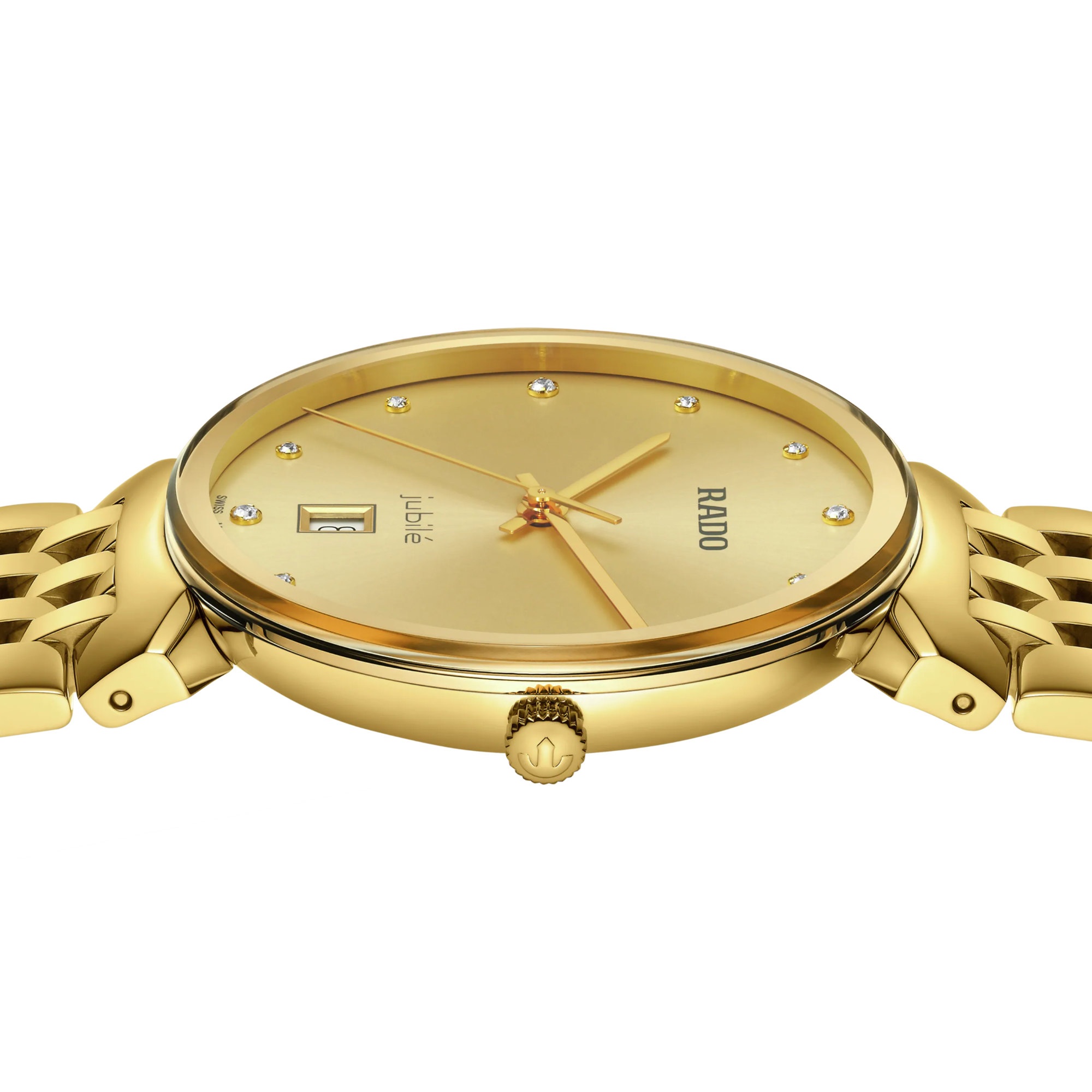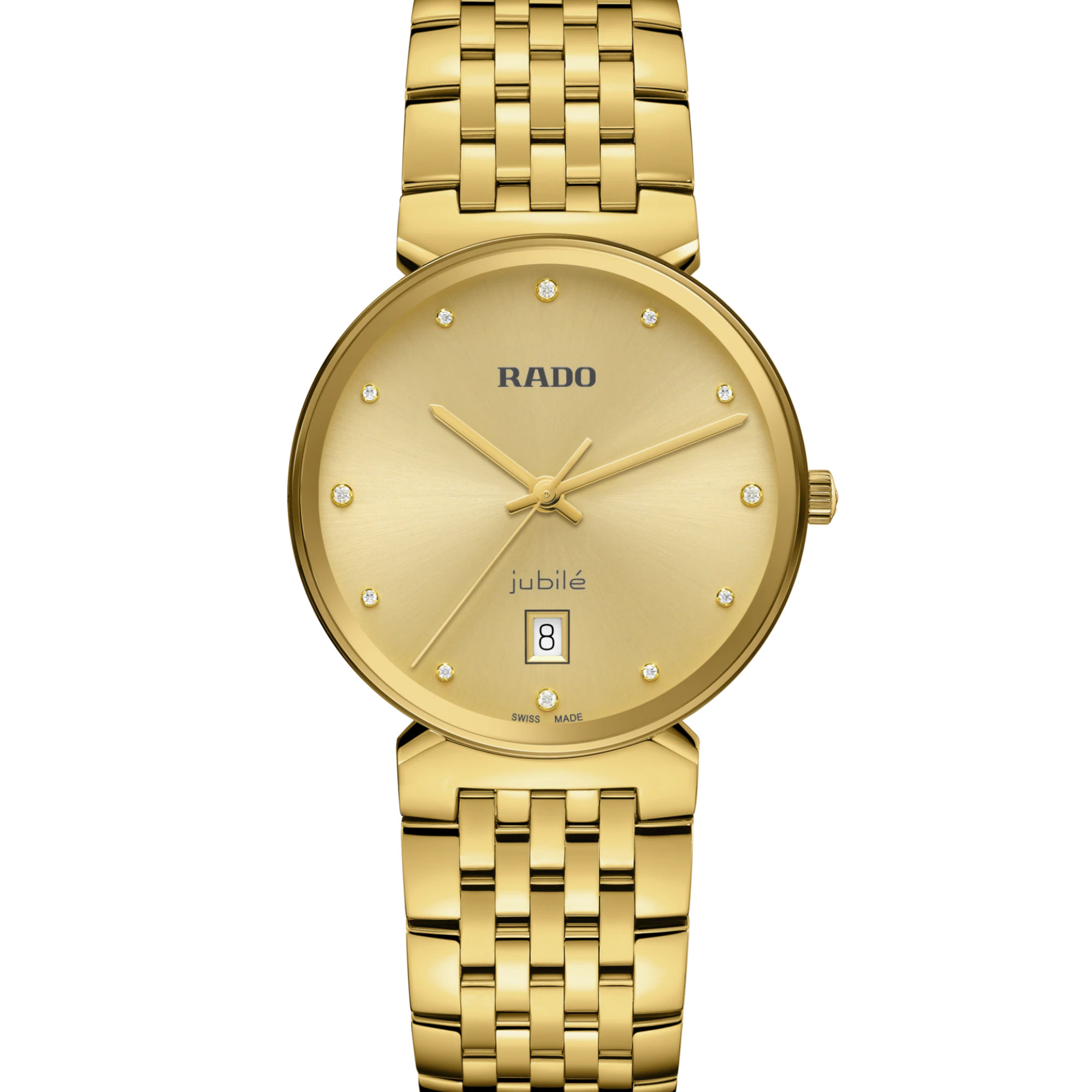 Ref. R48914713 - Das harmonische Design der Rado Florence ruft einem die eleganten Kuppeln und Türme der Stadt in Erinnerung, der die Kollektion ihren Namen zu verdanken hat. Die durch ein zuverlässiges Rado Quarzwerk vom Kaliber R073 mit drei Zeigern betriebene Uhr gewährleistet eine grössere Genauigkeit und Stossfestigkeit. Die 38 mm grosse Uhr verfügt über ein gewölbtes Saphirglas mit facettierten Rändern. Zudem sind Gehäuse, Krone, Lünette und Gehäuseboden aus einem beeindruckenden Material gefertigt: poliertem gelbgoldfarbenen Edelstahl mit PVD-Beschichtung. Abgerundet wird die Gesamtoptik dieses klassischen Zeitmessers durch ein Armband aus poliertem gelbgoldfarben beschichteten Edelstahl.