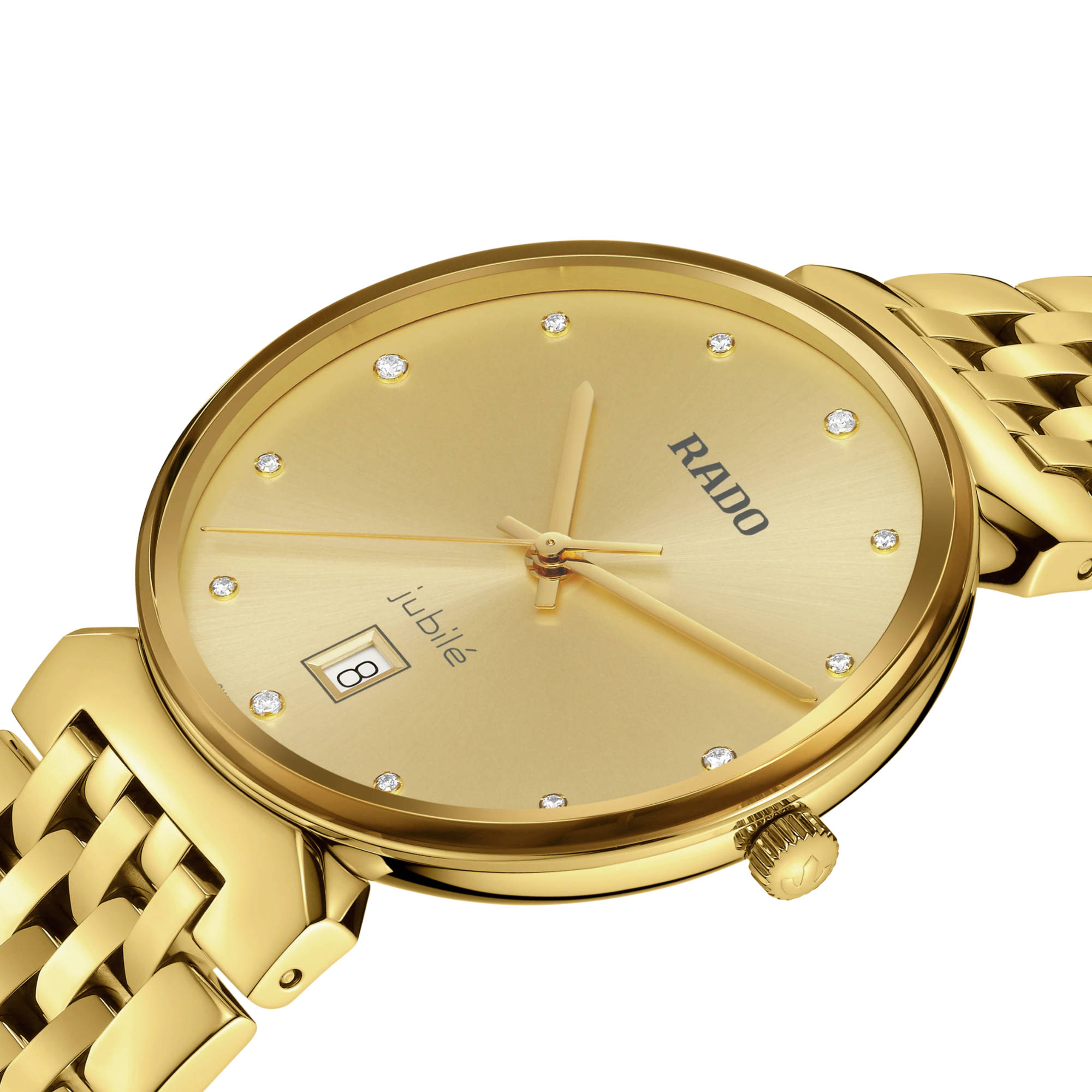 Das gelbgoldene Zifferblatt mit 12 Diamanten wird durch das per Druck aufgetragene Jubilé-Logo noch besser zur Geltung gebracht und ist perfekt auf die gelbgoldfarbenen Zeiger abgestimmt. Die Uhr ist bis zu einer Tiefe von 50 m wasserdicht und auch in Grösse S erhältlich – damit ist sie die perfekte Paar-Uhr.