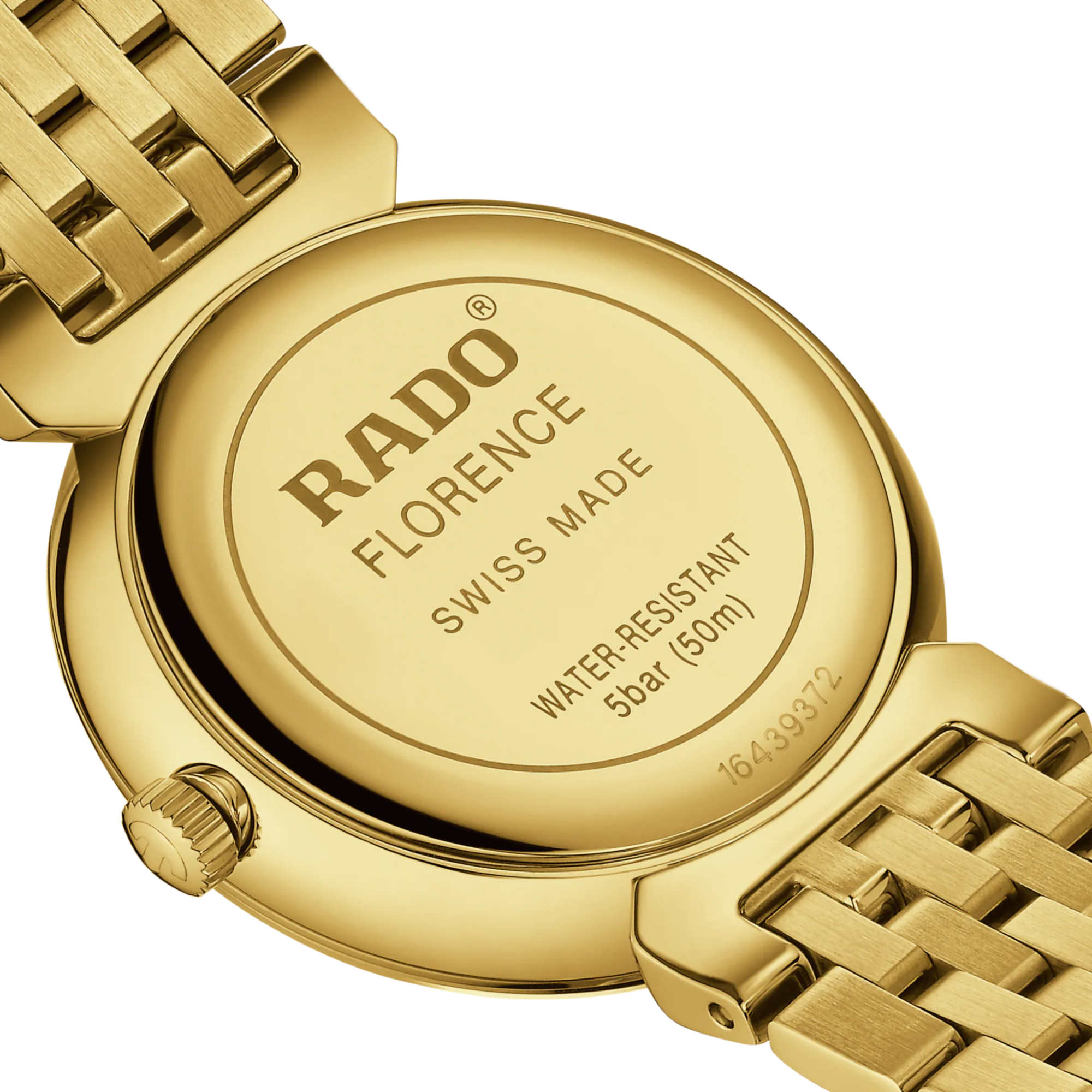 Ref. R48915903 - Das harmonische Design der Rado Florence ruft einem die eleganten Kuppeln und Türme der Stadt in Erinnerung, der die Kollektion ihren Namen zu verdanken hat. Die durch ein zuverlässiges Rado Quarzwerk vom Kaliber R079 mit drei Zeigern betriebene Uhr gewährleistet eine grössere Genauigkeit und Stossfestigkeit. Die 30 mm grosse Uhr verfügt über ein gewölbtes Saphirglas mit facettierten Rändern. Zudem sind Gehäuse, Krone, Lünette und Gehäuseboden aus einem beeindruckenden Material gefertigt: poliertem gelbgoldfarbenen Edelstahl mit PVD-Beschichtung.