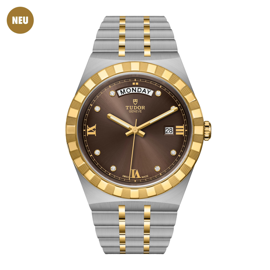 Ref. M28603-0008 - TUDOR hat die Auswahl an Zifferblättern der beliebten Royal Linie um ein lachs- sowie ein schokoladenfarbenes Zifferblatt im Sonnenschliff erweitert, die durch eine überraschende und erlesene Optik überzeugen. Die Royal Linie bietet sportliche und schicke Uhren mit Selbstaufzug sowie integrierten Armbändern, die sich durch Erschwinglichkeit und Eleganz gleichermaßen auszeichnen. Eine herausragende technische Leistung und eine raffinierte Ästhetik; diese Linie verkörpert eine Mischung aus klassischer Armbanduhr und Sportuhr. Der Name „Royal“ wurde von TUDOR erstmals in den 1950er-Jahren verwendet, um die herausragende Qualität seiner Armbanduhren hervorzuheben, die bis heute Bestand hat. Die Royal ist in Edelstahl oder in Gelbgold und Edelstahl sowie in vier Größen mit insgesamt dreizehn verschiedenen Zifferblättern für jeden Geschmack erhältlich. Alle Zifferblätter verfügen über diese applizierten Ziffern oder eine Kombination aus applizierten Ziffern und acht Diamantindizes.