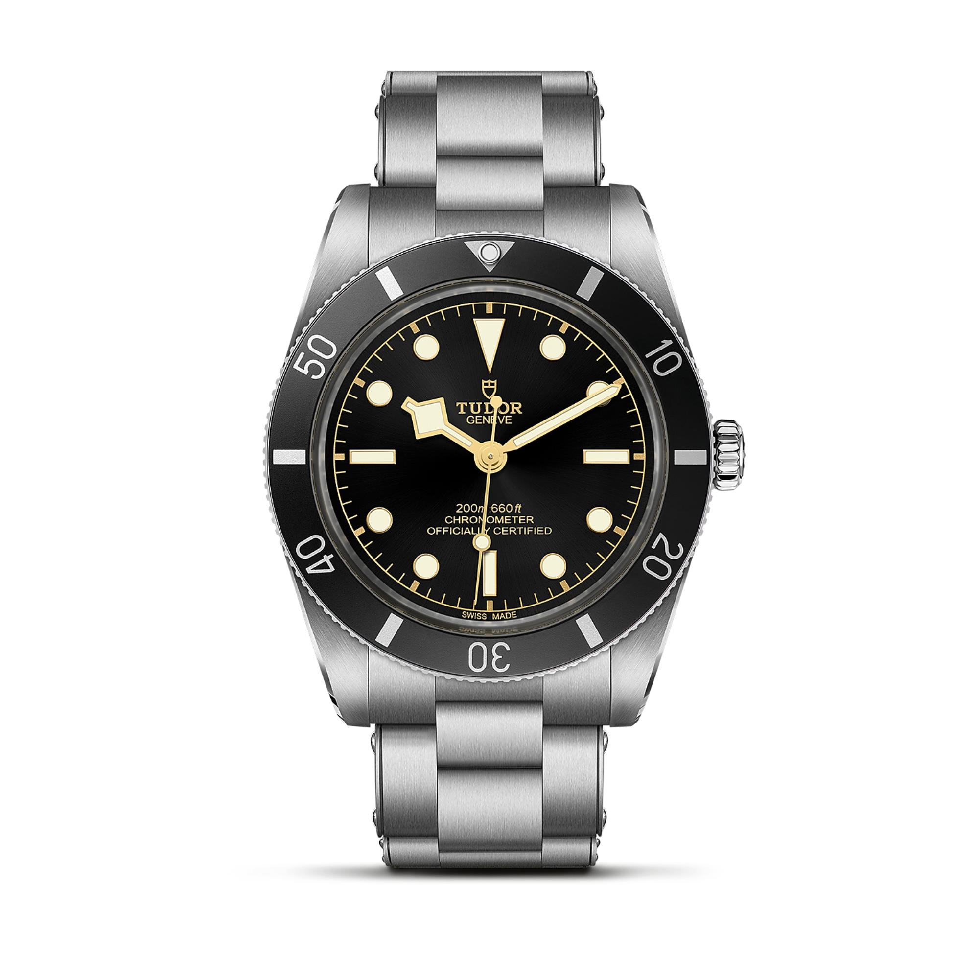 Ref. M79000N-0001 - Die Black Bay 54 empfindet die erste Taucheruhr von TUDOR, die Referenz 7922, mit größter Formtreue nach. Das Gehäuse von 37 mm behält die klassischen Proportionen aus vergangenen Zeiten bei. Dennoch zeichnet sich das Modell durch die technische Leistungs­fähigkeit von TUDORs einmaligem Manufaktur­werk Kaliber MT5400 sowie eine Wasserdichtigkeit bis 200 Meter Tiefe aus.